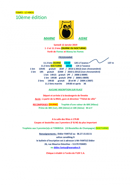 Samedi 12 janvier 2019, l'Union Sportive de FISMES organisait la 10ème édition du trail du HIBOU... Une édition anniversaire qui méritait bien une nouveauté. Ainsi les coureurs pouvaient, au choix, prendre le départ du...
