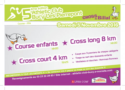 Quelques jours seulement après les 10KM de COUCY lES EPPES, Philippe SCHAFF participait à la cinquième édition du cross de BILLAL à BUCY-LES-PIERREPONT. Plusieurs courses étaient proposées aux enfants et 2 pour les adultes, 4000M...