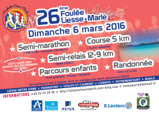 Le dimanche 06 mars 2016 avait lieu la 26ième foulée LIESSE-MARLE. Plusieurs courses étaient proposées: une course de 5KM, un semi-relais (12-9KM), des parcours pour les enfants, une randonnée mais ce qui fait le succès de...