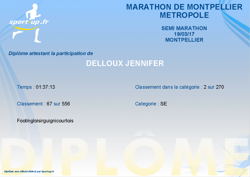 Voici une destination qui sent bon les vacances… Ce n'est pourtant pas que dans ce cadre que Jennifer DELLOUX (accompagné de son frère) s'est rendu à MONTPELLIER ce dimanche 19 mars pour participer au premier semi-marathon organisé par la ville. Une excellente préparation pour le marathon de PARIS sous la chaleur printanière et presque estivale de la méditérranée avec en prime un podium à la clé… Ce week-end, même le SUD a entendu parler du FOOTING LOISIR GUIGNICOURTOIS… Bravo Jennifer!